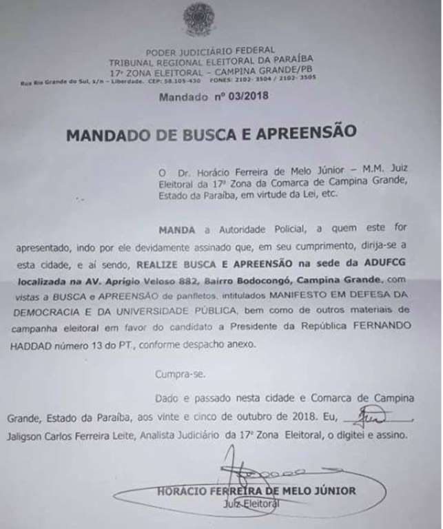 Pelo menos duas universidades – a Universidade Federal de Campina Grande (UFCG), na Paraíba, e da Universidade do Estado da Bahia (Uneb), campus de Serrinha (a 175 km de Salvador) – foram alvo nesta quinta-feira, 25, de ações da Justiça Eleitoral ou do Ministério Público Eleitoral por suposta propaganda eleitoral irregular a favor do candidato do PT ao Palácio do Planalto, Fernando Haddad, que disputa o segundo turno das eleições presidenciais com Jair Bolsonaro (PSL).