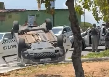 A viatura capotou com quatro policiais militares dentro, que tiveram apenas ferimentos leves. O outro veículo envolvido no acidente era conduzido por uma mulher, que não ficou ferida, de acordo com a polícia. Os policiais do 5º BPM tinham sido acionados para atender com prioridade uma suposta ocorrência de arrastão dentro de uma casa no bairro San Vale.